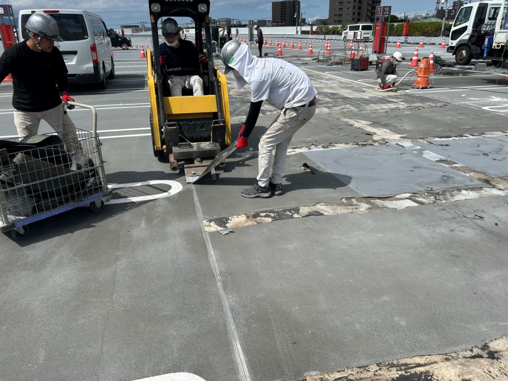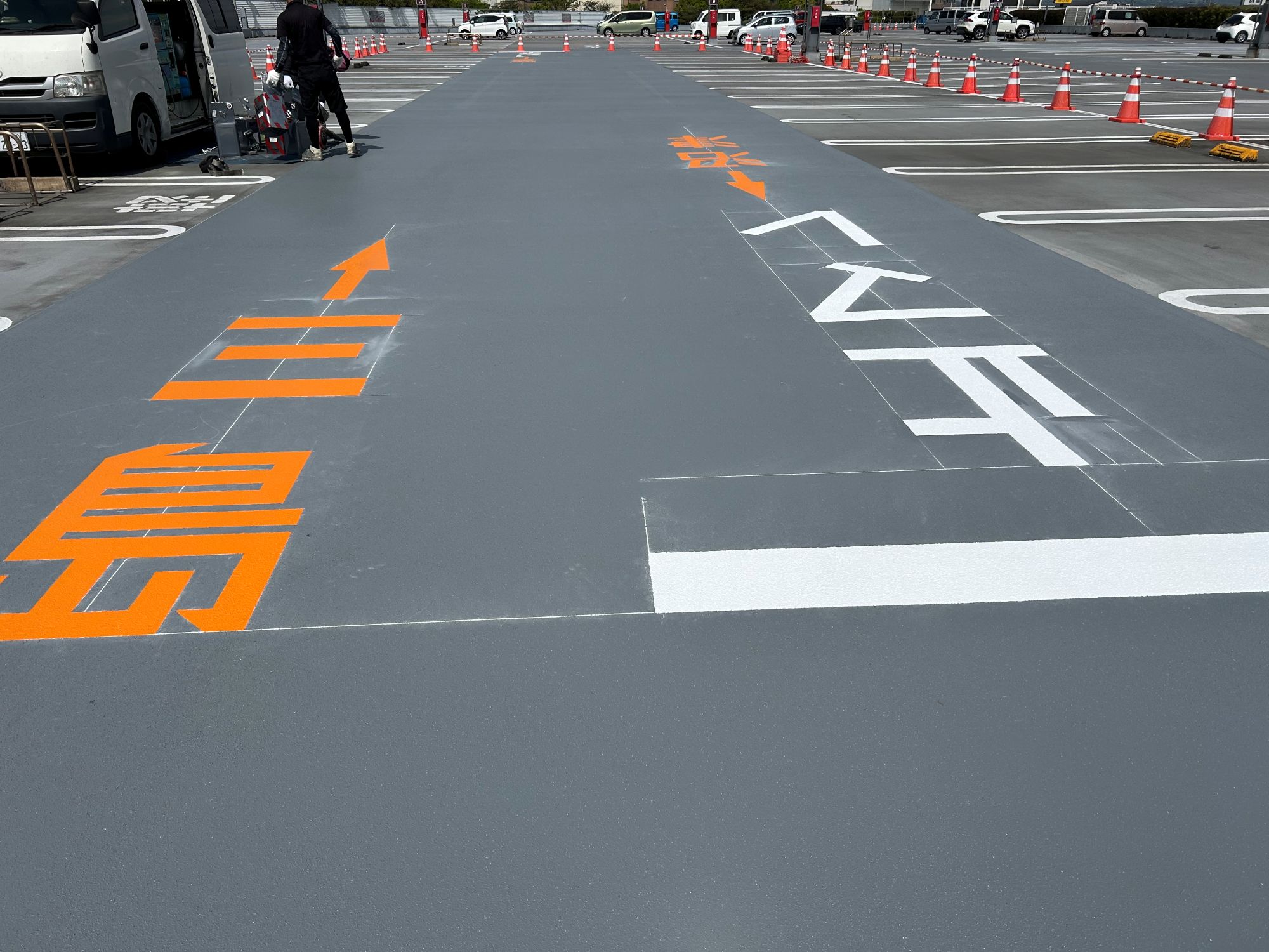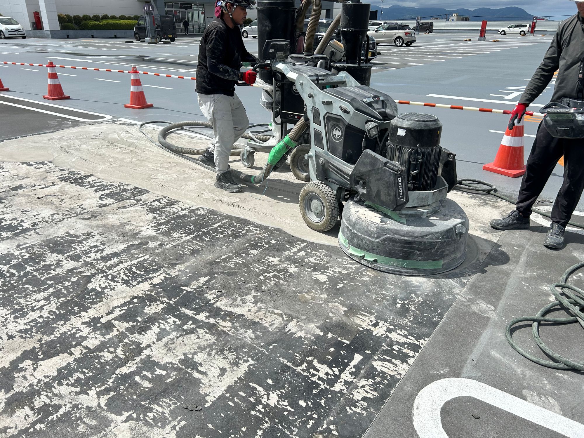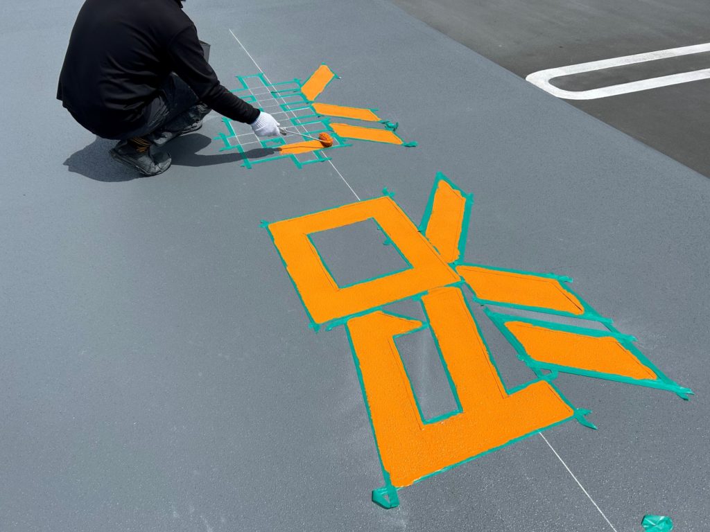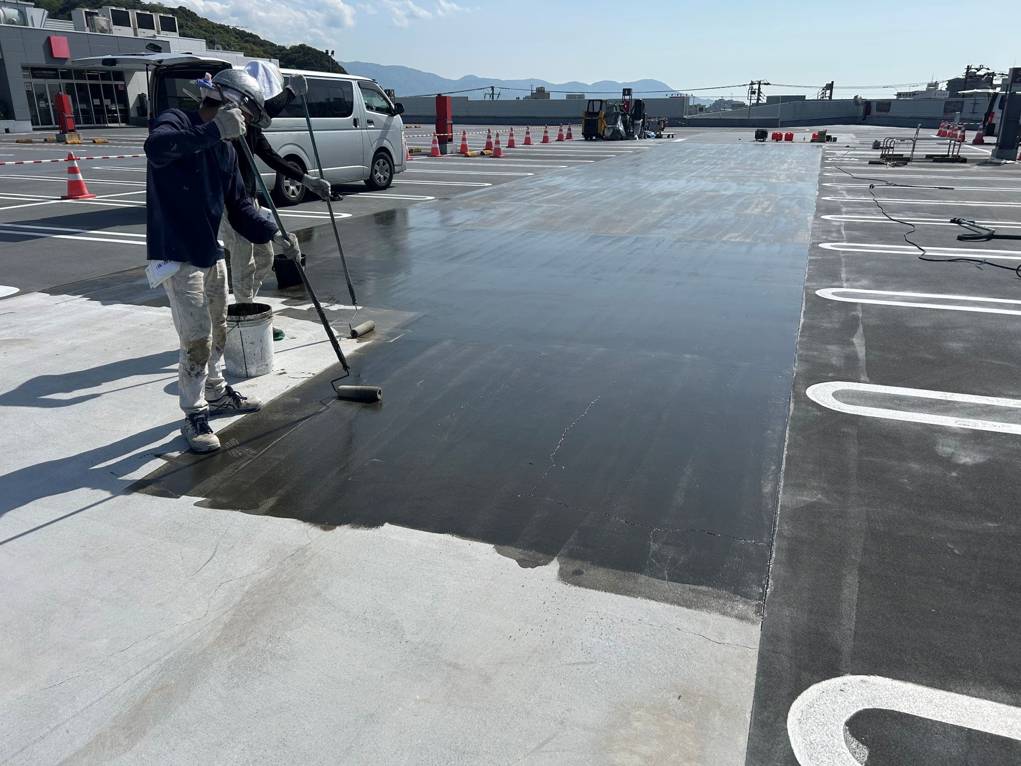 静岡県某店舗屋上駐車場防水工事 2026年1月29日 最終更新日時 : 2026年1月29日 kumag 施工場所 :屋上駐車場施工内容 :既存防水層撤去・研磨処理・平場 超速硬化ウレタン塗膜防水・文字復旧 施工中 施工後
