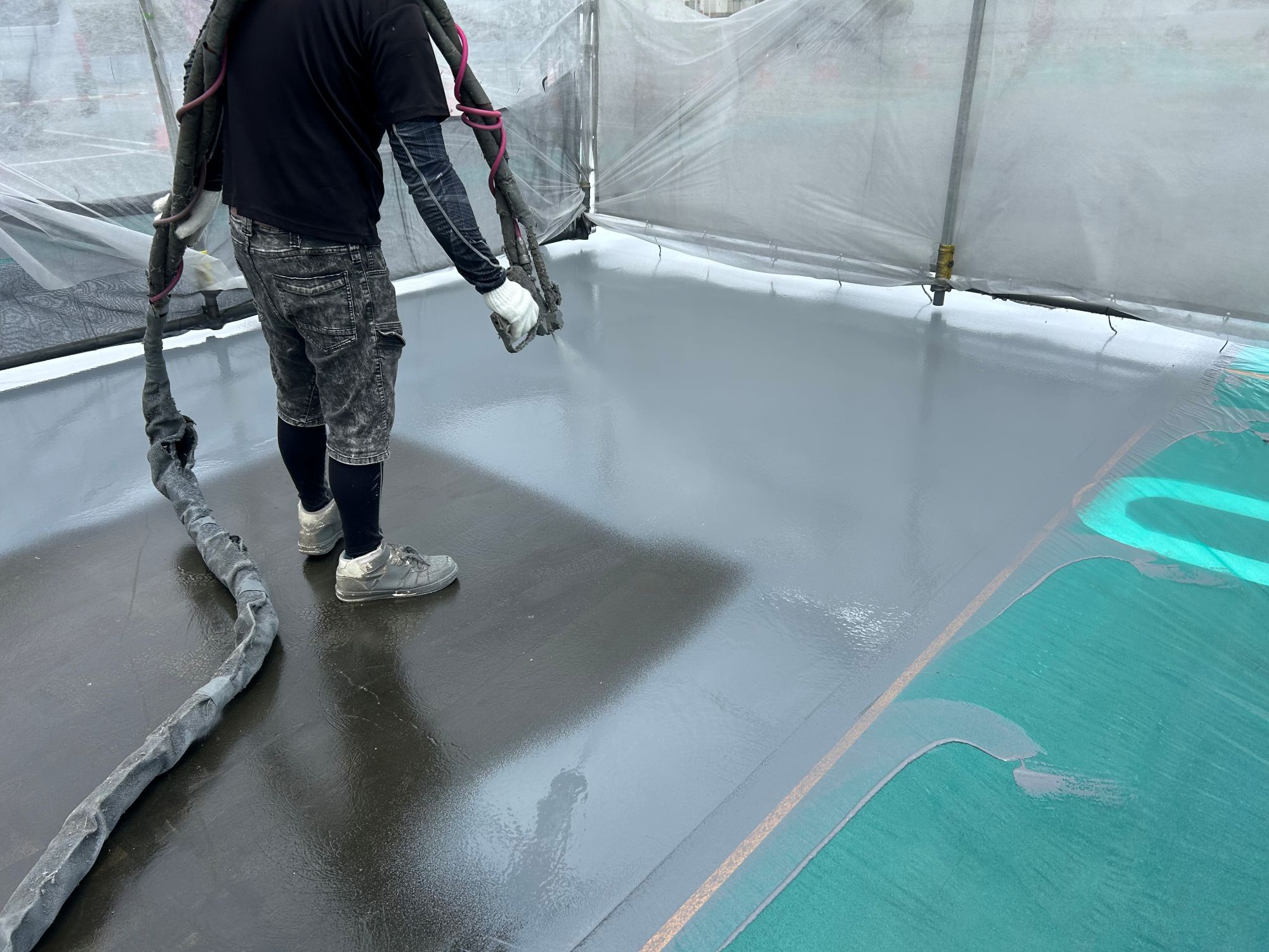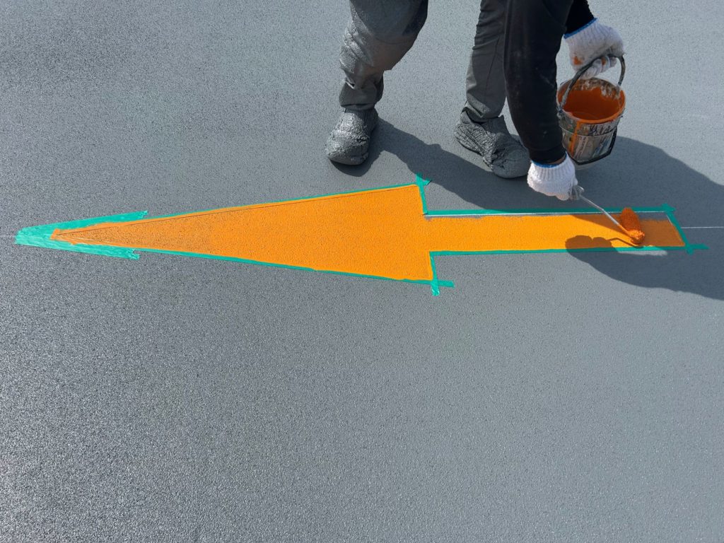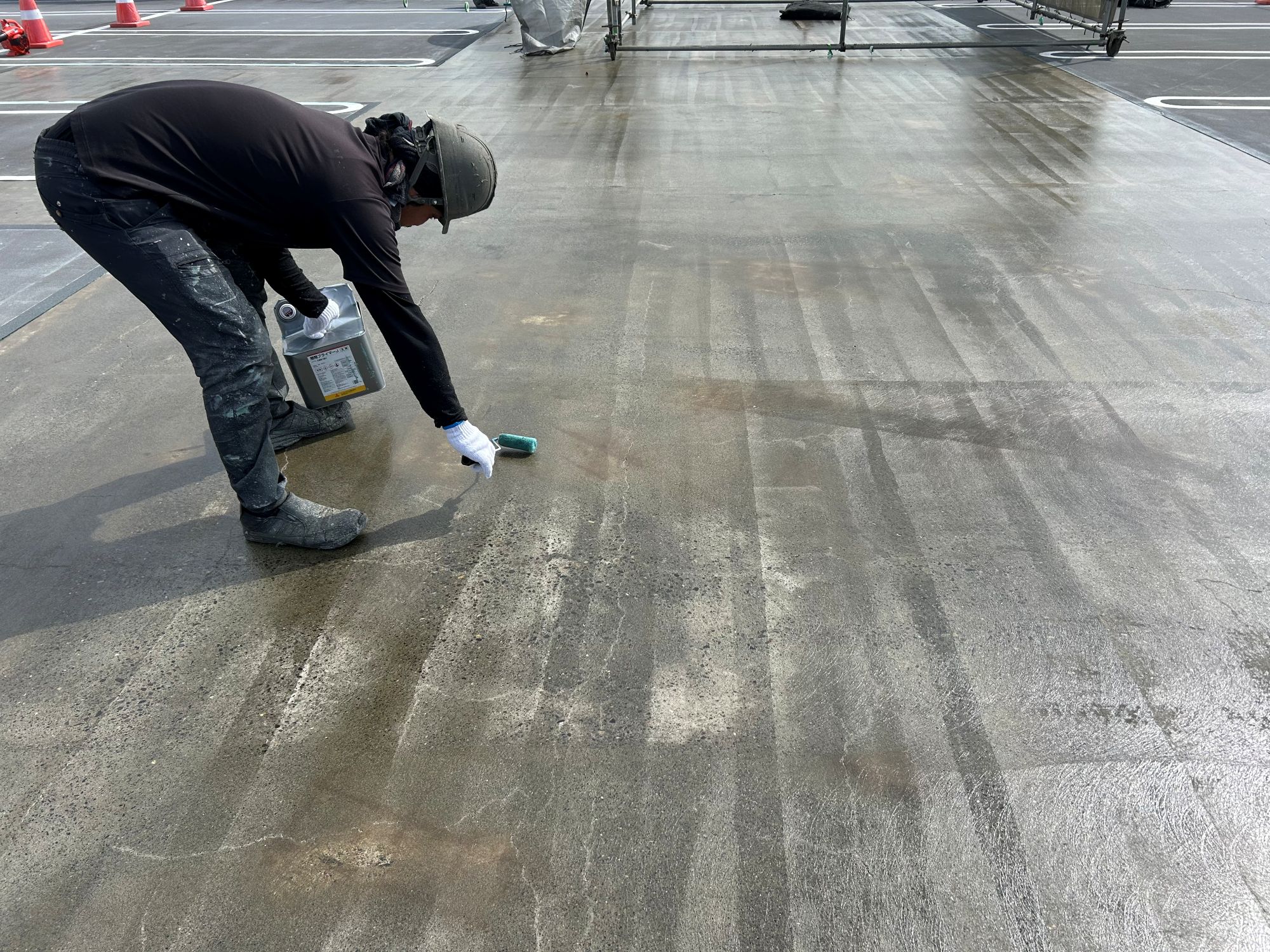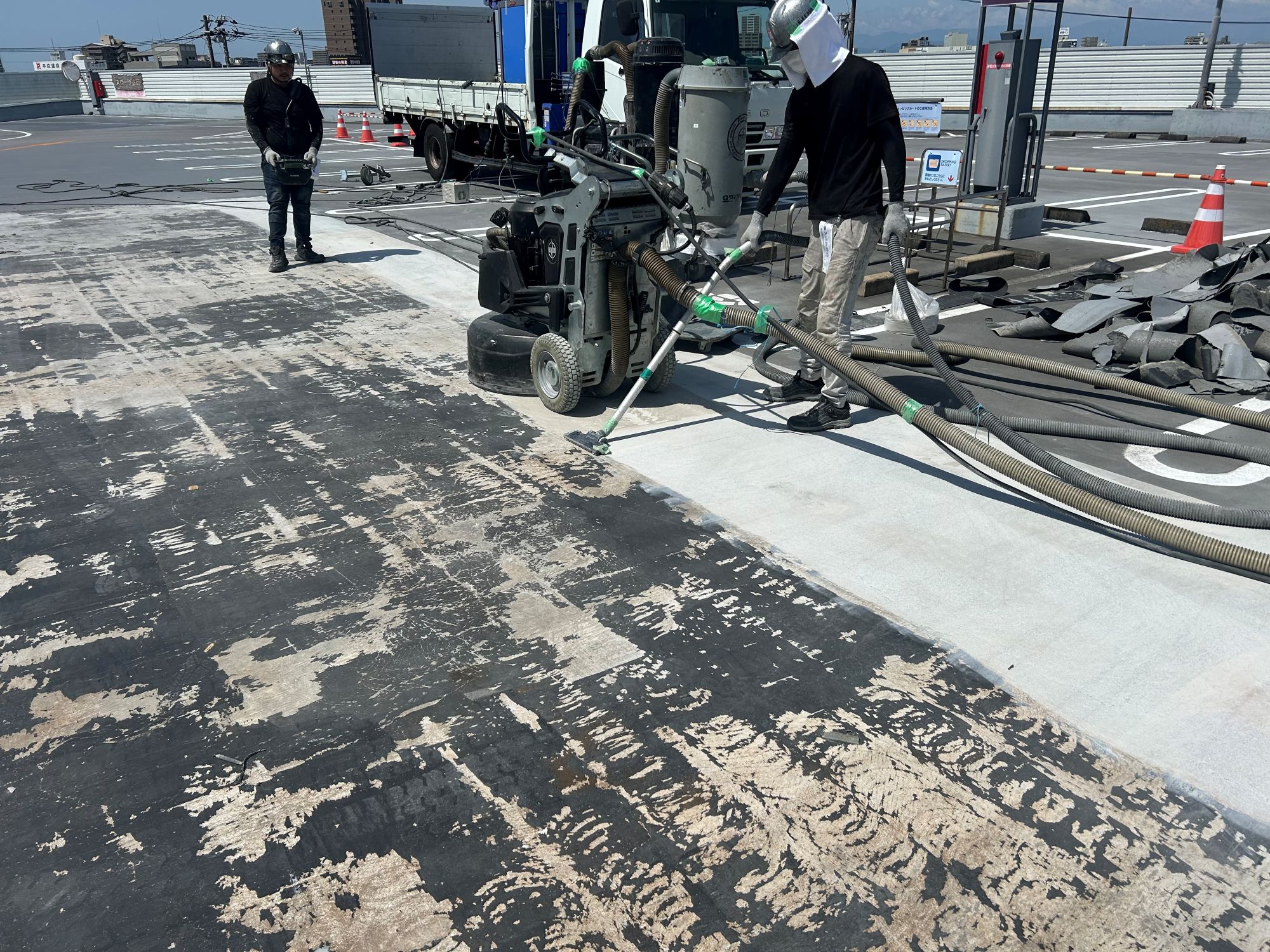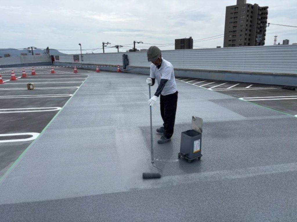 静岡県某店舗屋上駐車場防水工事 2026年1月29日 最終更新日時 : 2026年1月29日 kumag 施工場所 :屋上駐車場施工内容 :既存防水層撤去・研磨処理・平場 超速硬化ウレタン塗膜防水・文字復旧 施工中 施工後